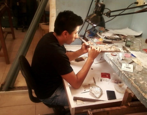Estos trabajos son realizados con materiales, como: oro, plata y piedras semipreciosas, entre estas corales, la concha Spondylus, concha perla y coral rojo. Este taller se realizó desde el año 2006, con la radicación de la fundación Nobis de Isabel Noboa junto con alianzas estratégicas de empresas públicas y privadas que con muchos esfuerzos sacaron adelante este proyecto con 18 jóvenes de la comunidad, actualmente solo 2 jóvenes se dedican a esta actividad y la desarrollan mediante pedidos, con diferentes diseños.